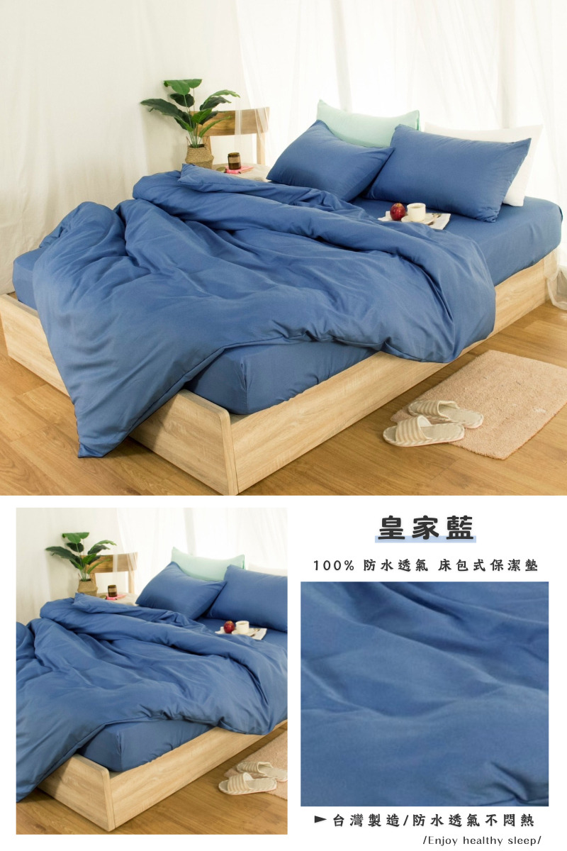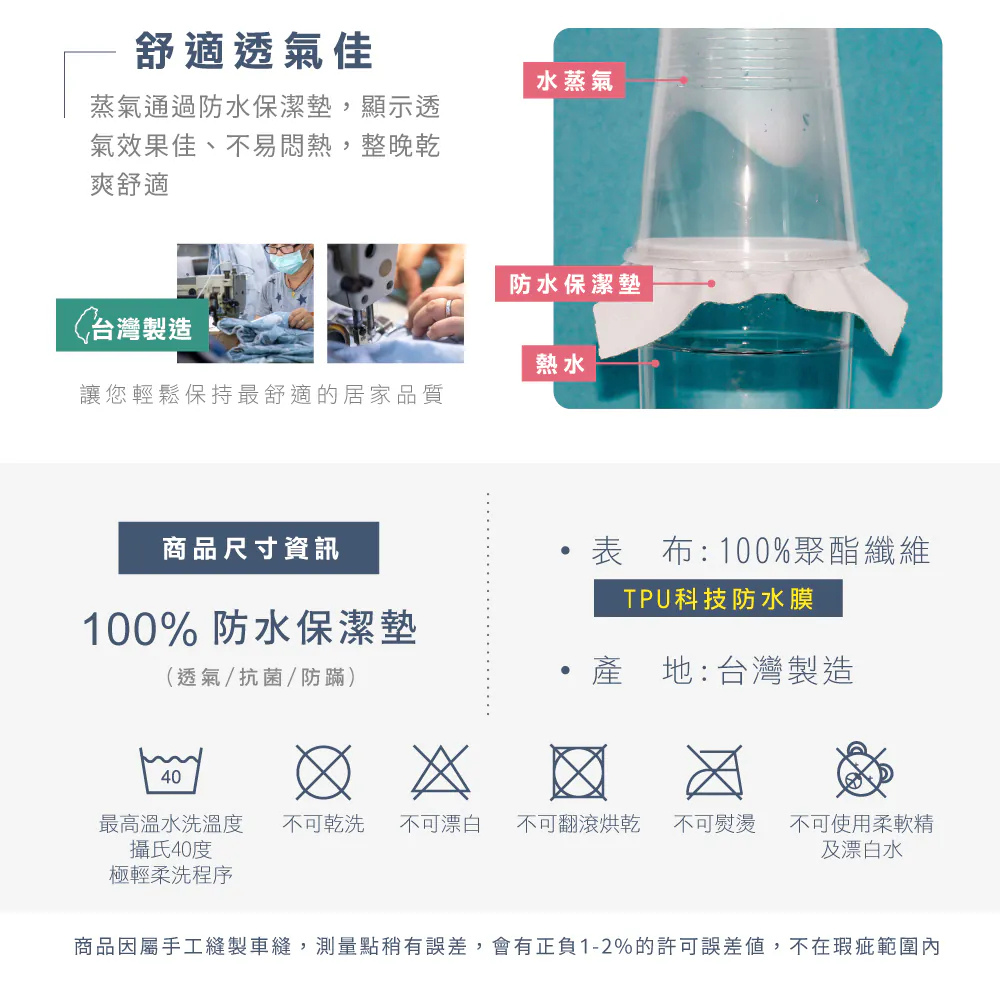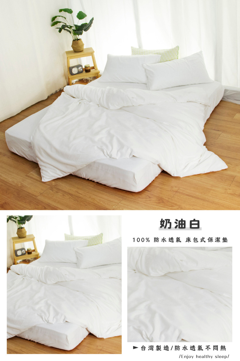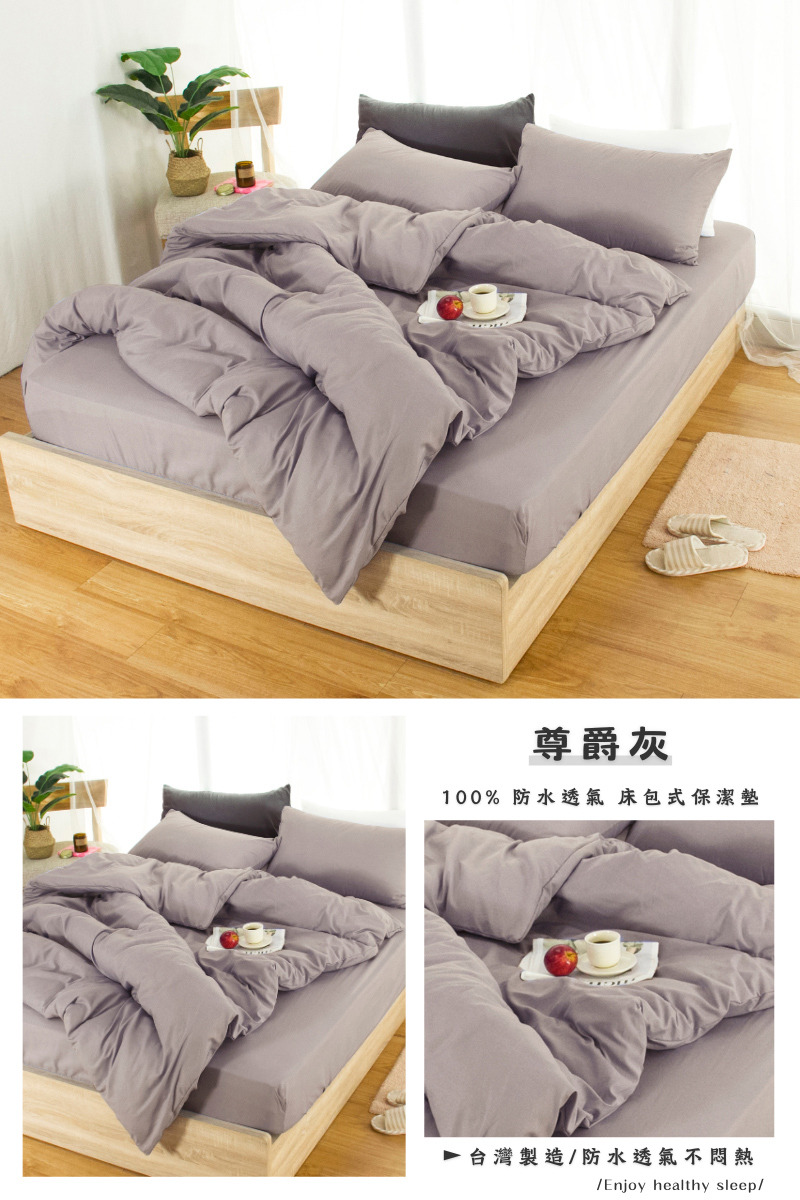 【尺寸規格】 單人床包 / 3.5尺 (105*186cm±5%) / 包覆高度為30cm 雙人床包 / 5尺 (150*186cm±5%) / 包覆高度為30cm 加大床包 / 6尺 (180*186cm±5%) / 包覆高度為30cm 特大床包 / 7尺 (180*210cm±5%) / 包覆高度為30cm 【材質】 表布: 100%超柔透氣布+3M吸濕排汗處理 底層:專利100%防水TPU透氣科技薄膜 【產地】MIT台灣製造
